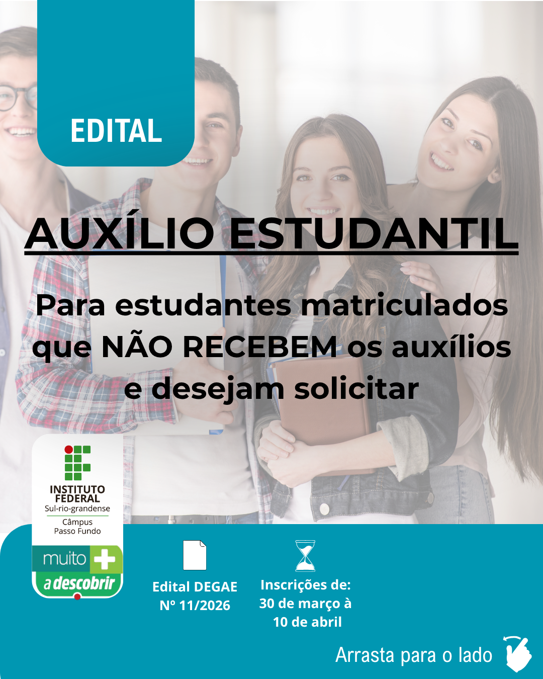 Inscrições ocorrem de 30 de março a 10 de abril e são destinadas a estudantes que não recebem auxílios estudantis